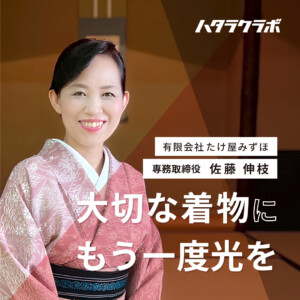 着物という日本の伝統文化を現代の日常に繋ぐ専門店、有限会社たけ屋みずほ。名古屋市瑞穂区に店を構える老舗呉服店は、95年にわたる歴史と共に、多くの人々の人生に寄り添い続けてきました。今回は、専務取締役の佐藤伸枝さんに、着物に対する真摯な姿勢、スタッフとの関係性、そして『ハタラク』という言葉に込める想いについて語っていただきました。