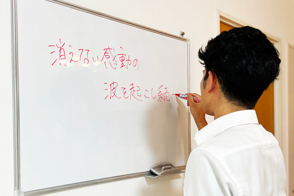 使命を果たすことです。僕の使命は「永遠に続く感動の波を起こし続けること」です。感動したことは記憶に残り、人を介して広まり、そして連鎖します。今⽇⼀⼈を感動させれば、その⼈が次の⼈へ伝え、さらにその先へと伝わり広がっていく。毎⽇それが続いていくと、100年後には6億⼈の⼈⽣を変えられるという計算になりました。笑
